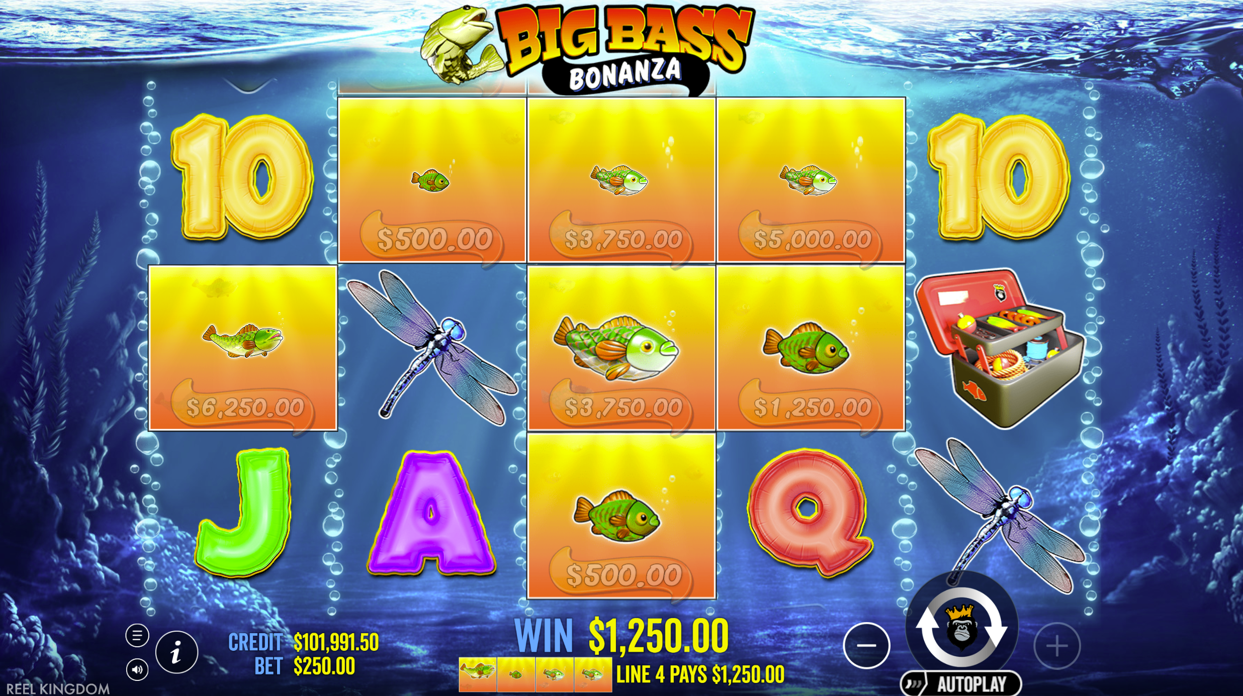 Get 3 or more scatter symbols (fishing floats) anywhere on the reels for 10, 15, or 20 free spins.