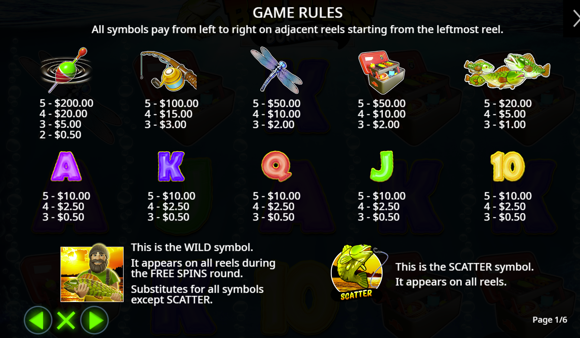 Get 3 or more scatter symbols (fishing floats) anywhere on the reels for 10, 15, or 20 free spins.